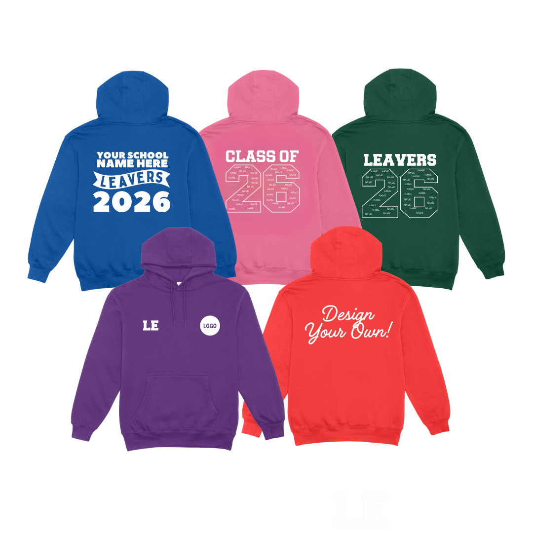We've got lots of hoody colours to choose from and various brand new prints for 2026. We can supply sizing sets to School and even drop off your hoodies to school when they're ready!