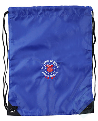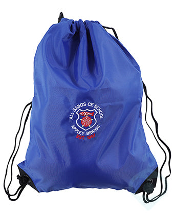 Royal blue PE Bag for All Saints with an embroidered logo to the front with black drawstrings.