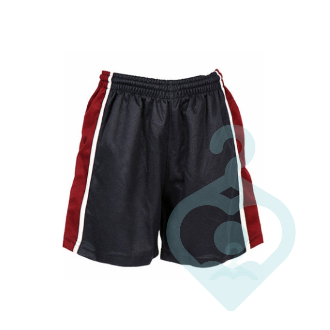 Male fit training shorts in Navy/Maroon for Byrchall High School.