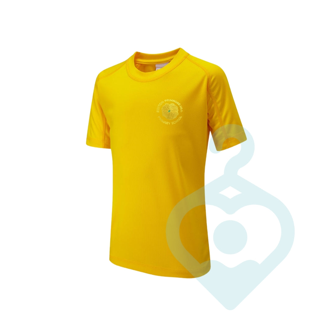 PE T-Shirt in blue, red, yellow or green (depending on what 'House' your child belongs to) for Euxton Primrose Hill Primary School.