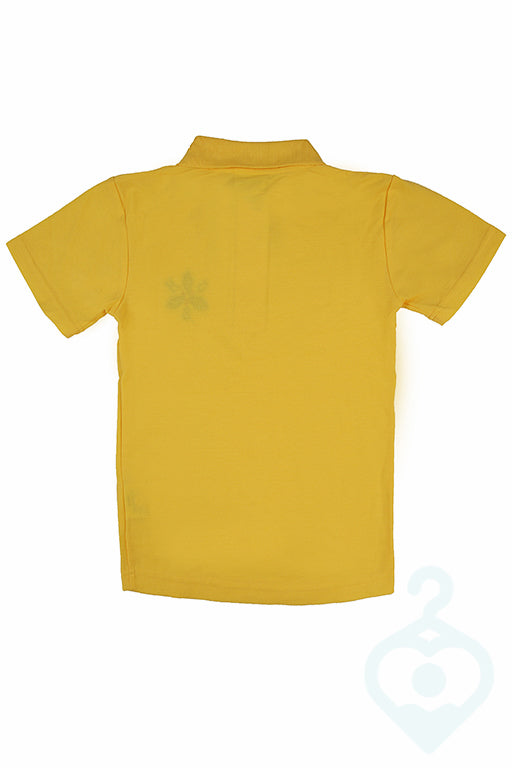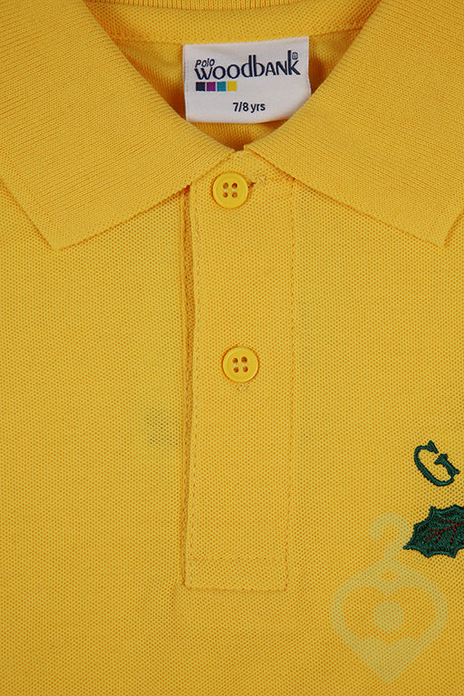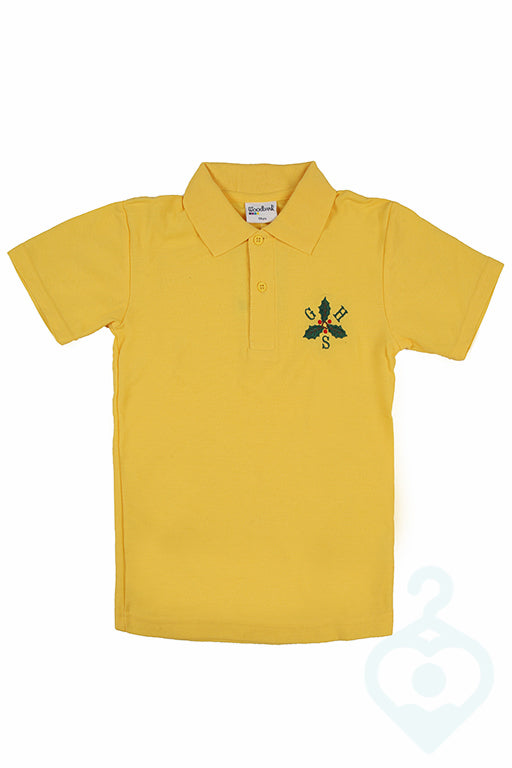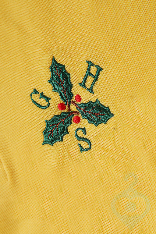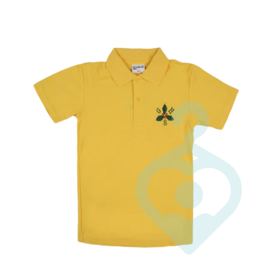 A Gold Polo Shirt for Gilded Hollins with an embroidered logo.