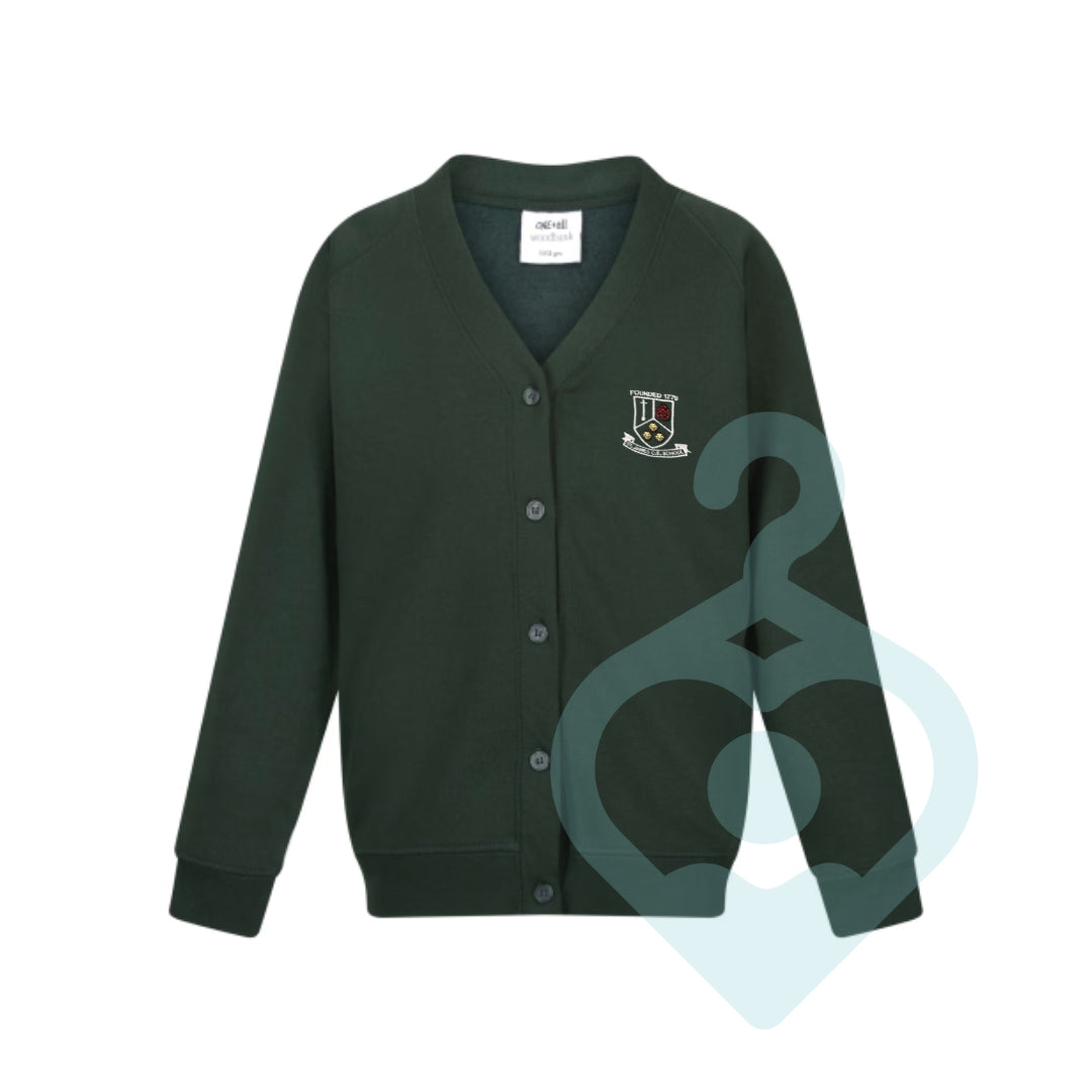 A Bottle Green Cardigan for Leyland St James with an embroidered logo.