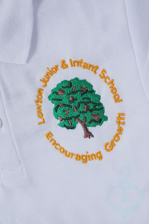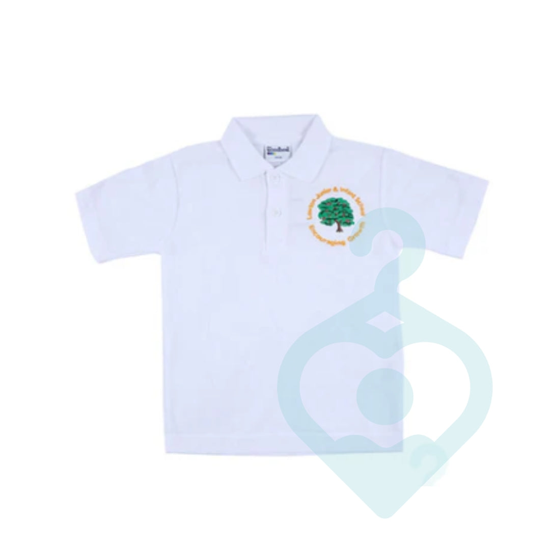 A White Polo Shirt for Lowton Junior and Infants with an embroidered logo.