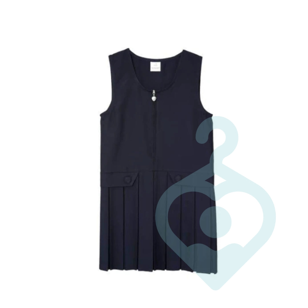 Drop Waist Pinafore in navy blue with pleats and zip fastening.