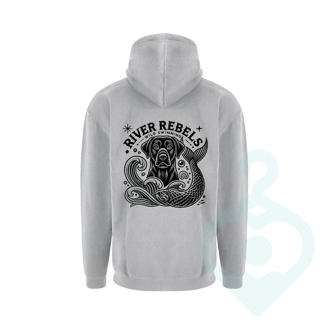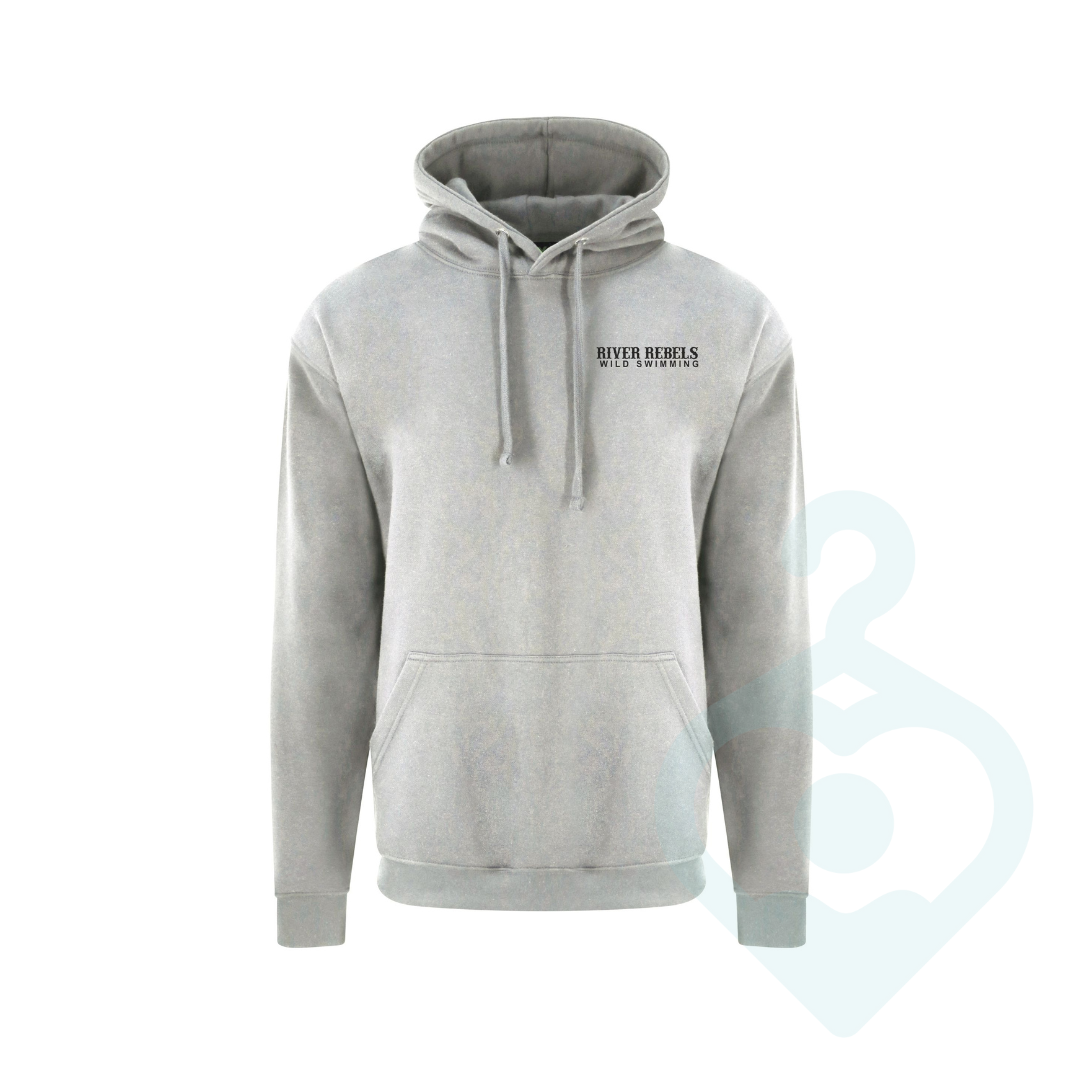 Heather grey Hoody for River Rebels with a front left chest and large rear print.