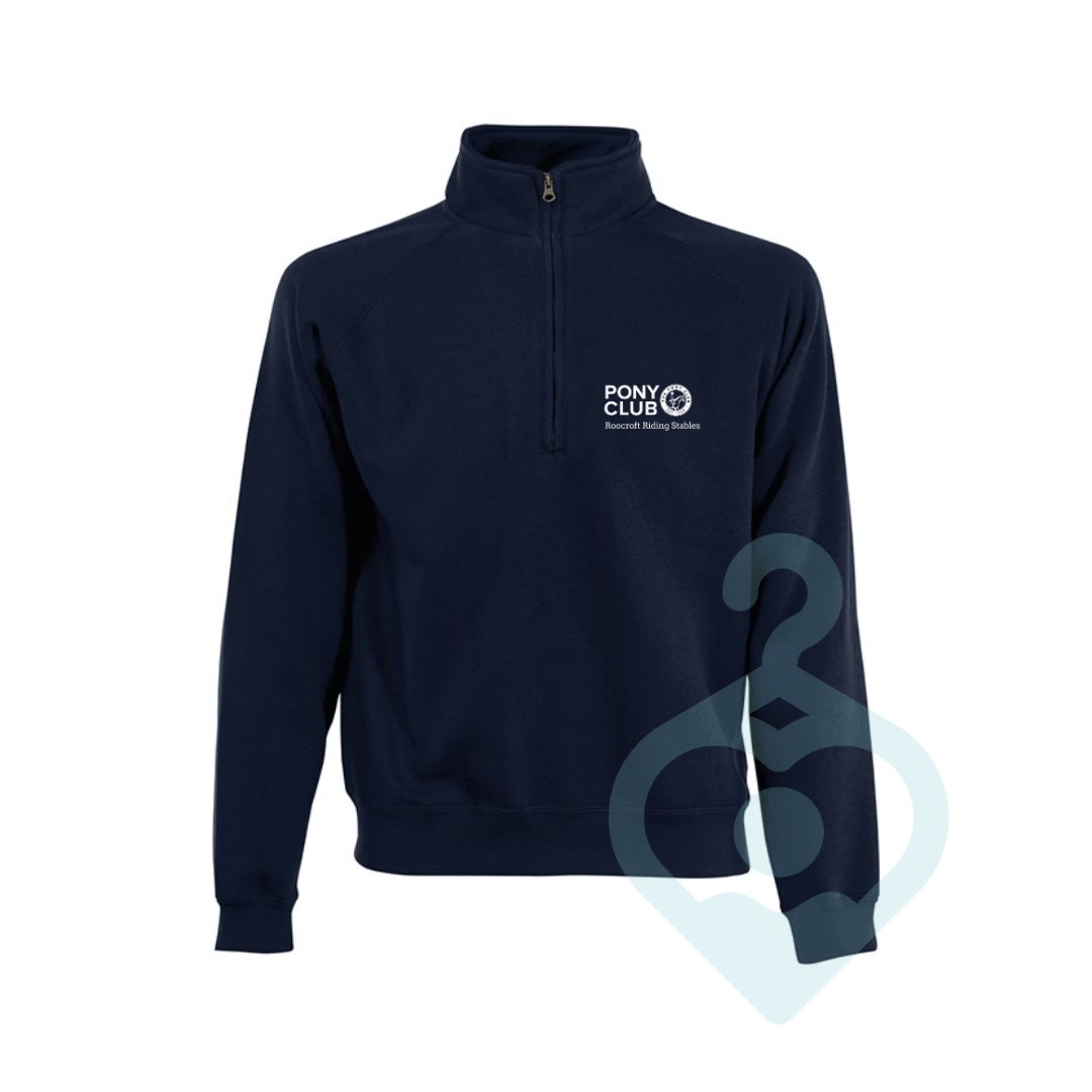 Navy quarter zip sweat with a front printed logo for Roocroft Pony Club.