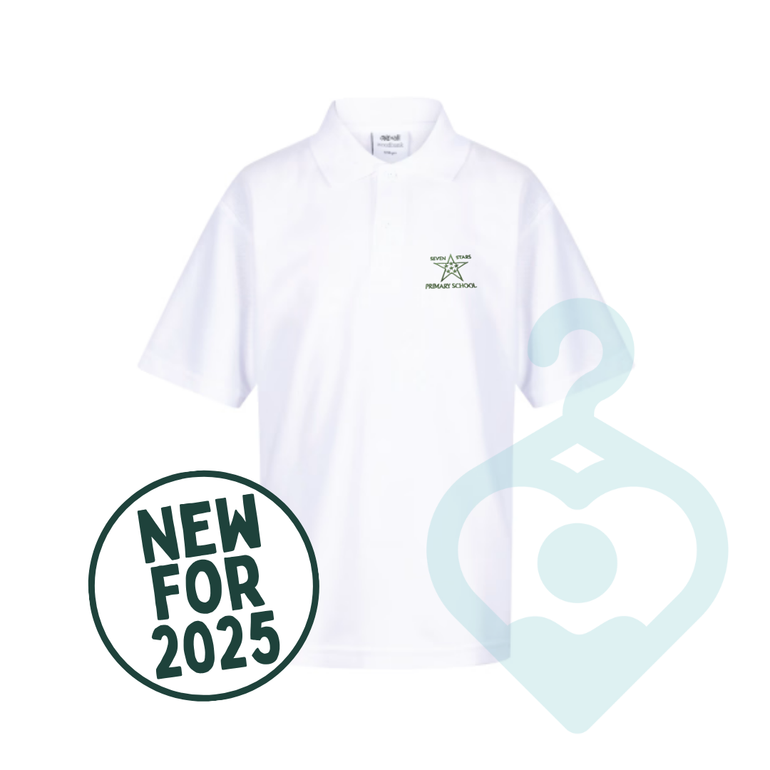 A white polo shirt for Seven Stars Primary School with an embroidered school logo.