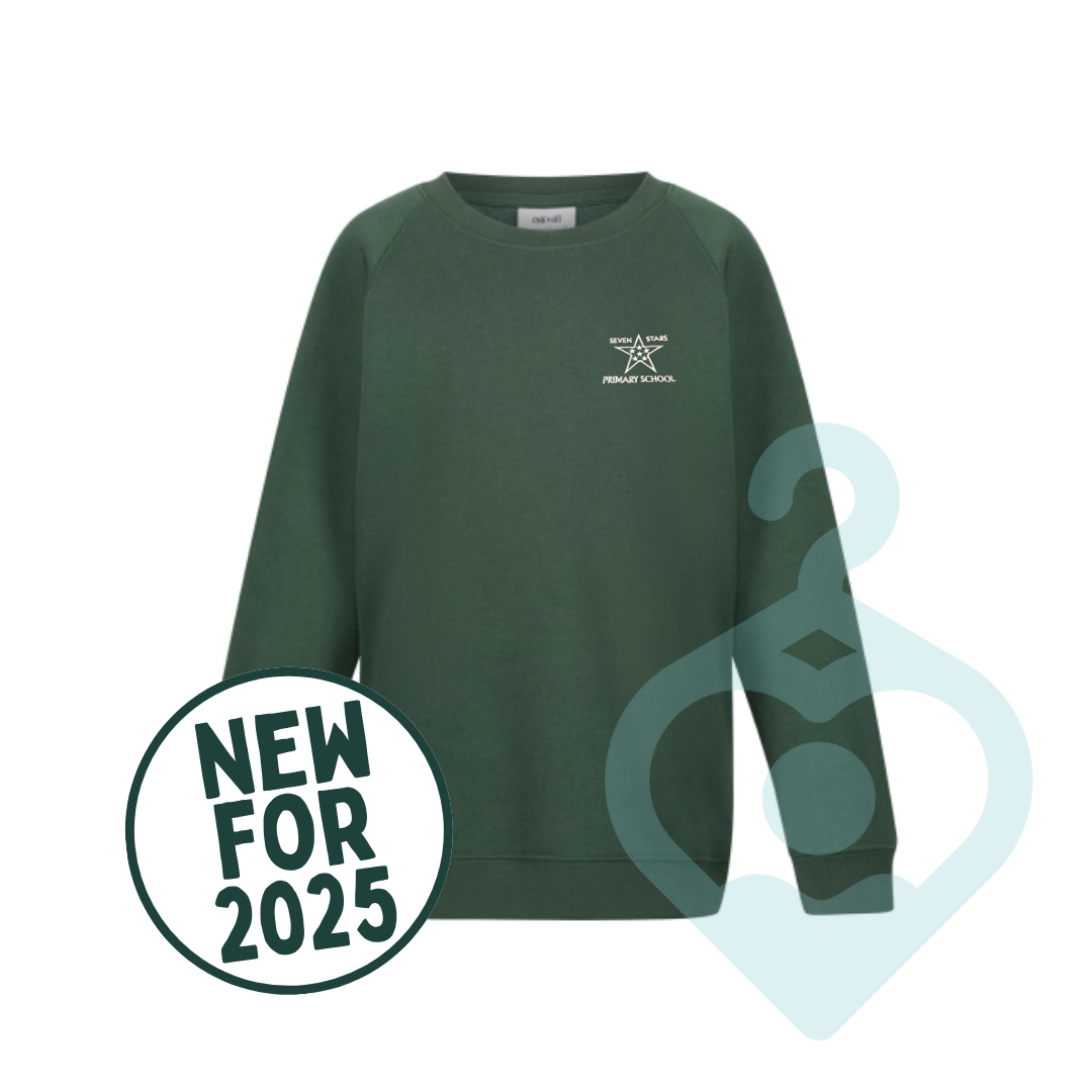A green crewneck sweatshirt for Seven Stars Primary School with an embroidered school logo.