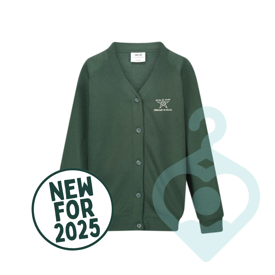 A green cardigan for Seven Stars Primary School with an embroidered school logo.
