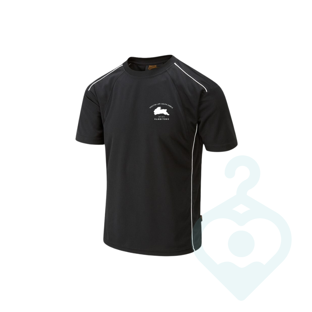 Rabbitohs training t-shirt, available in a black/black option or a black/green option.