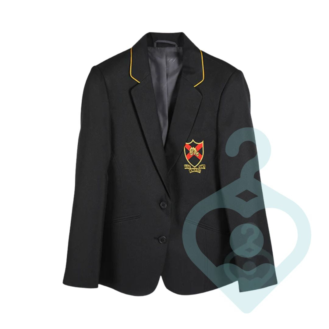 This jacket has an embroidered logo and the school motif on the front left chest.