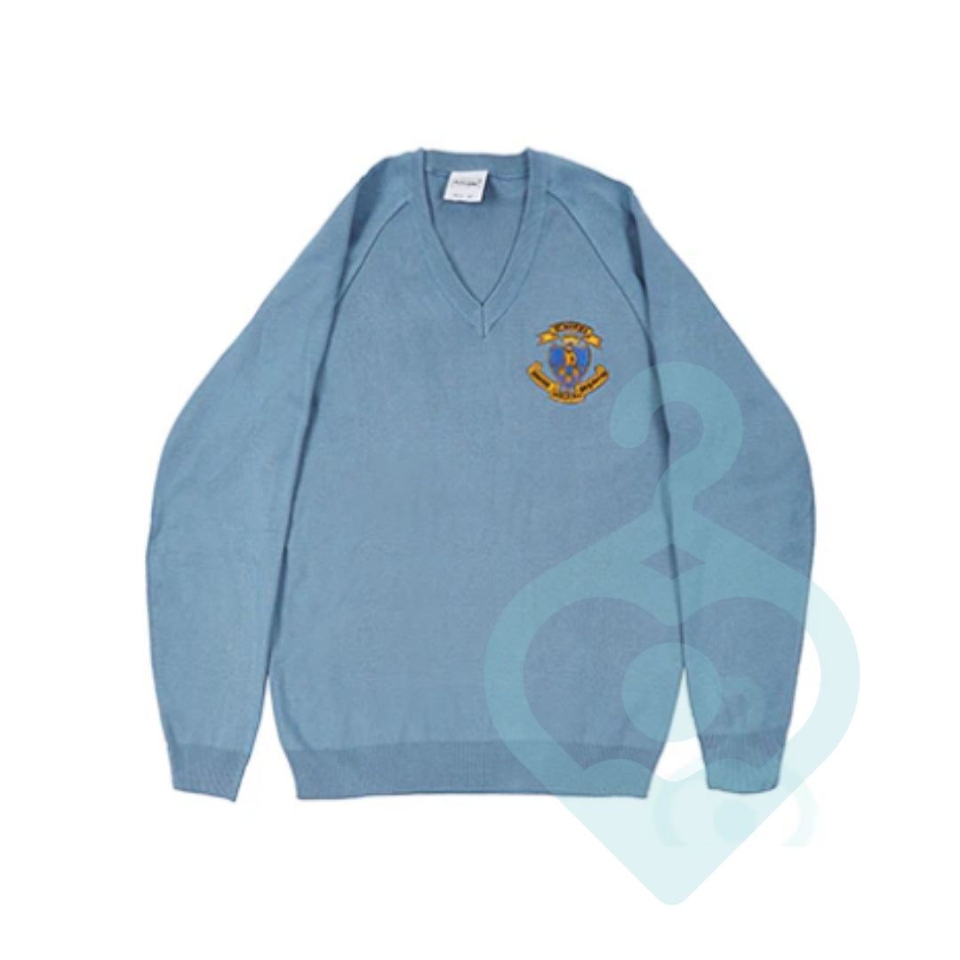 St Marie’s Y6 Jumper, in light blue with embroidered school emblem.