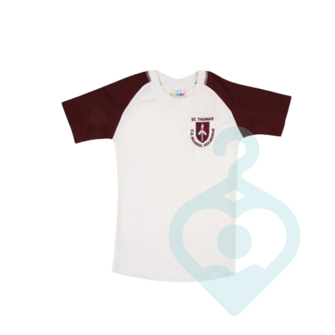 PE T-Shirt in White/Maroon for St Thomas' Primary School.